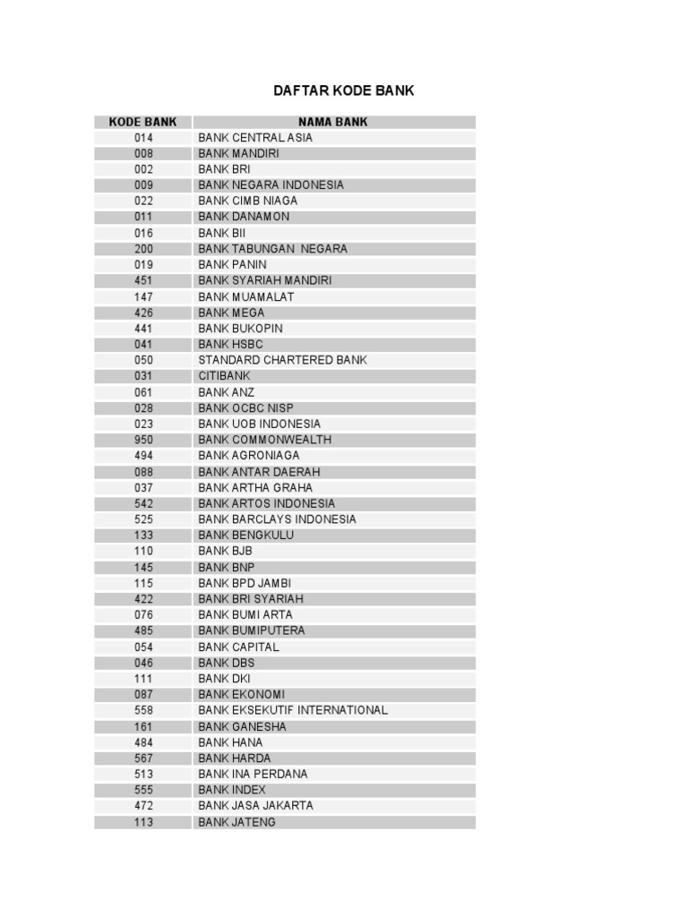 Kode kode bank. Dikurasi dan diurutkan oleh flip berdasarkan frekuensi pencarian. Tiap bank memiliki kode bank yang berbeda beda. Kode bank bri bca mandiri bni untuk keperluan transfer dan bank syariah lainnya yang sebagian besar merupakan anggota atm bersama serta daftar kode bank di indonesia milik daerah.