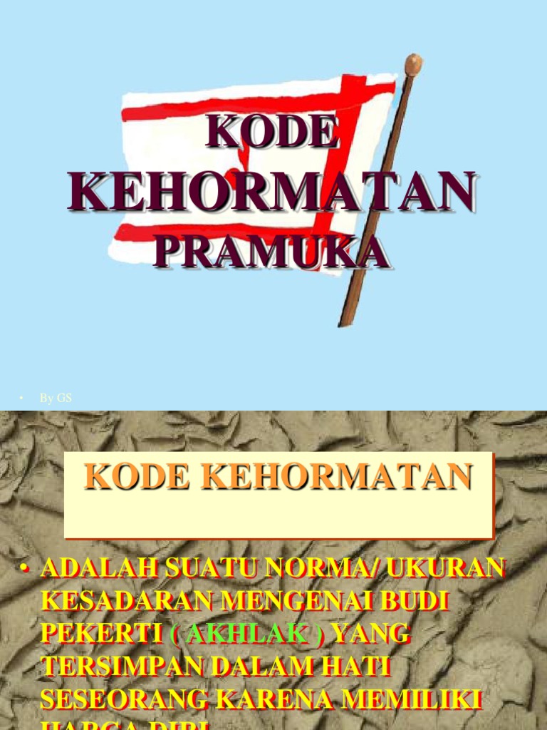 Kode kehormatan pramuka kode kehormatan adalah suatu norma aturan yang menjadi ukuran kesadaran mengenai ahlak budi pekerti yang tersimpan dalam hati seseorang yang menyadari harga dirinya. Kode kehormatan pramuka adalah suatu norma dalam kehidupan pramuka yang menjadi ukuran atau standar tingkah laku pramuka di masyarakat.