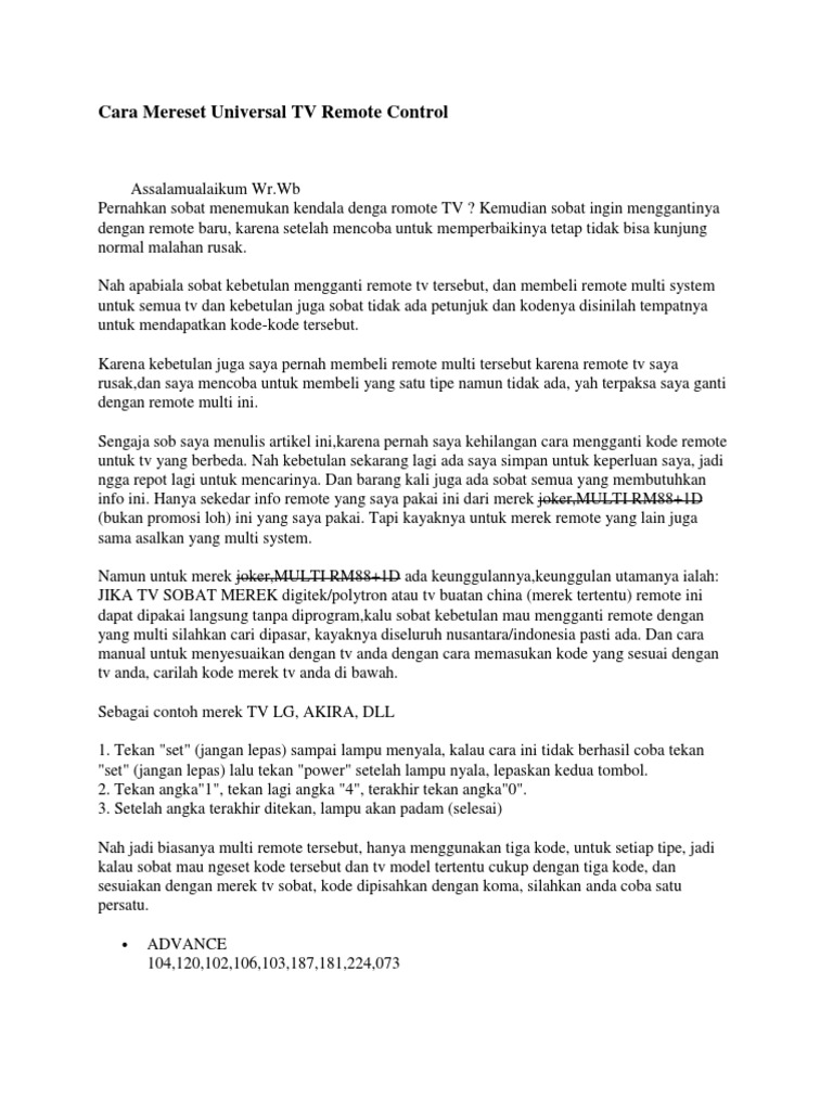 Kode Remot Multi Untuk Beberapa Merk Tv Umum Buku Teknisi